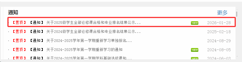 根据《吉林建筑大学本科学生专业调整管理办法(修订)》关于学生申请专业调整条件的要求,教务处对在校统招的大学一年级学生的全部必修课和排名情况进行审查。现将2025级学生的全部必修课合格和排名结果公示于教务管理系统->通知,见下图。请相关学生登录教务管理系统查询审查结果。